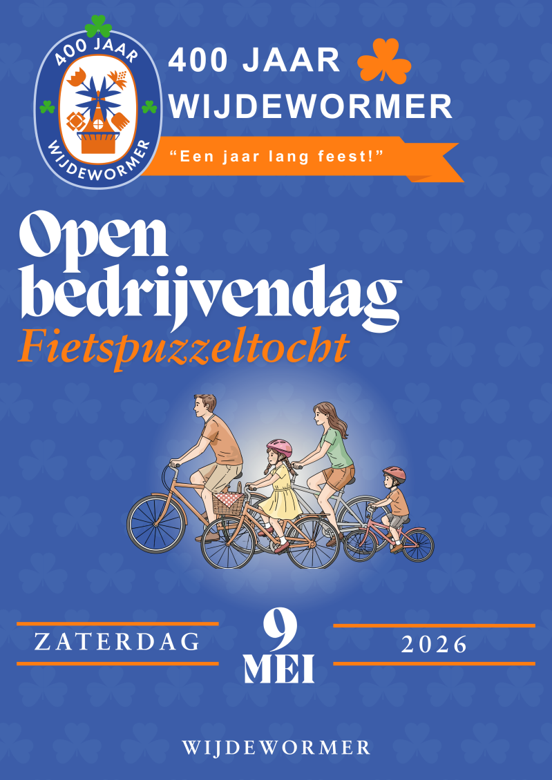 In het jubileumjaar waarin de Wijdewormer haar 400-jarig bestaan viert, organiseren we een feestelijke Open bedrijvendag door de hele polder. Een bijzondere dag waarop lokale ondernemers hun deuren openen en bezoekers een uniek kijkje achter de schermen krijgen.