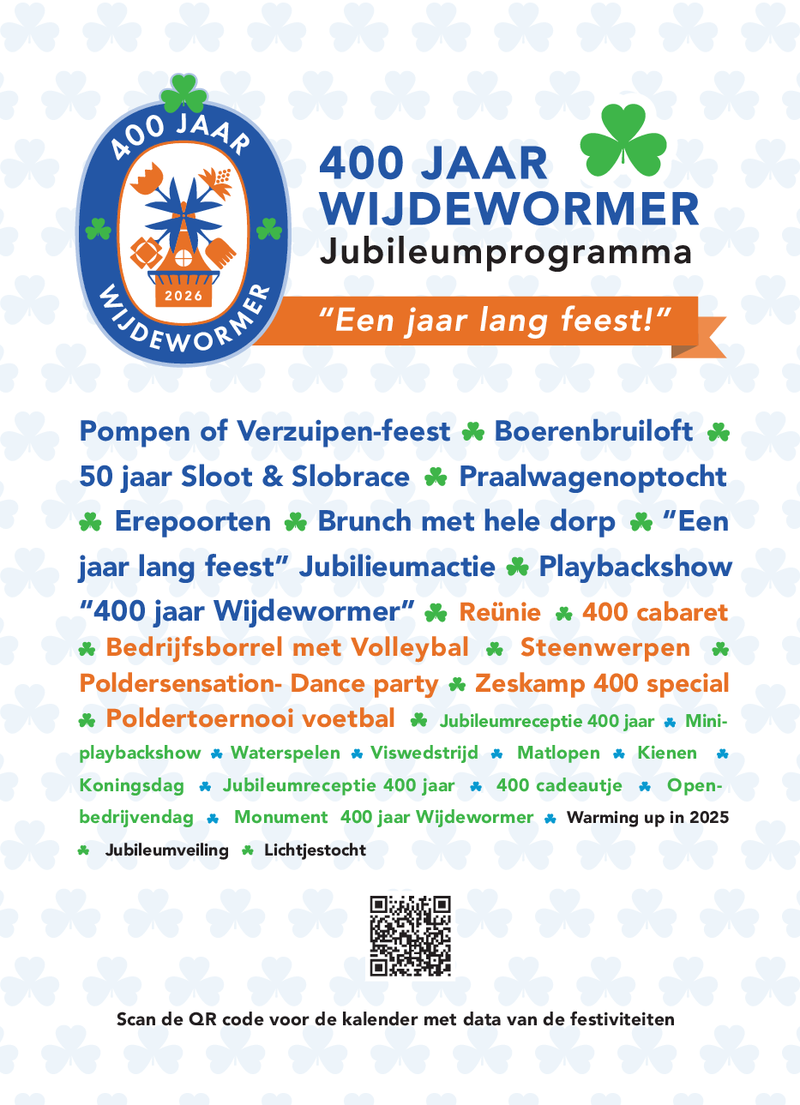 Op 22 november 2025 organiseert Wijdewormer een jubileumveiling ter ere van het 400-jarig bestaan van de polder. We streven ernaar om 400 unieke kavels te veilen, variërend van lokale diensten tot bijzondere ervaringen. Inwoners kunnen zowel kavels aanbieden als meebieden, en de opbrengst komt ten goede aan de jubileumviering.